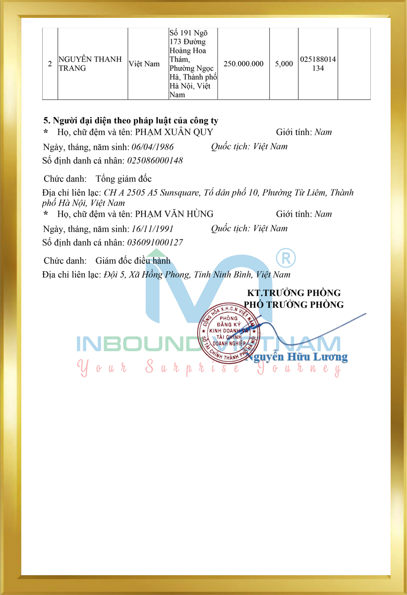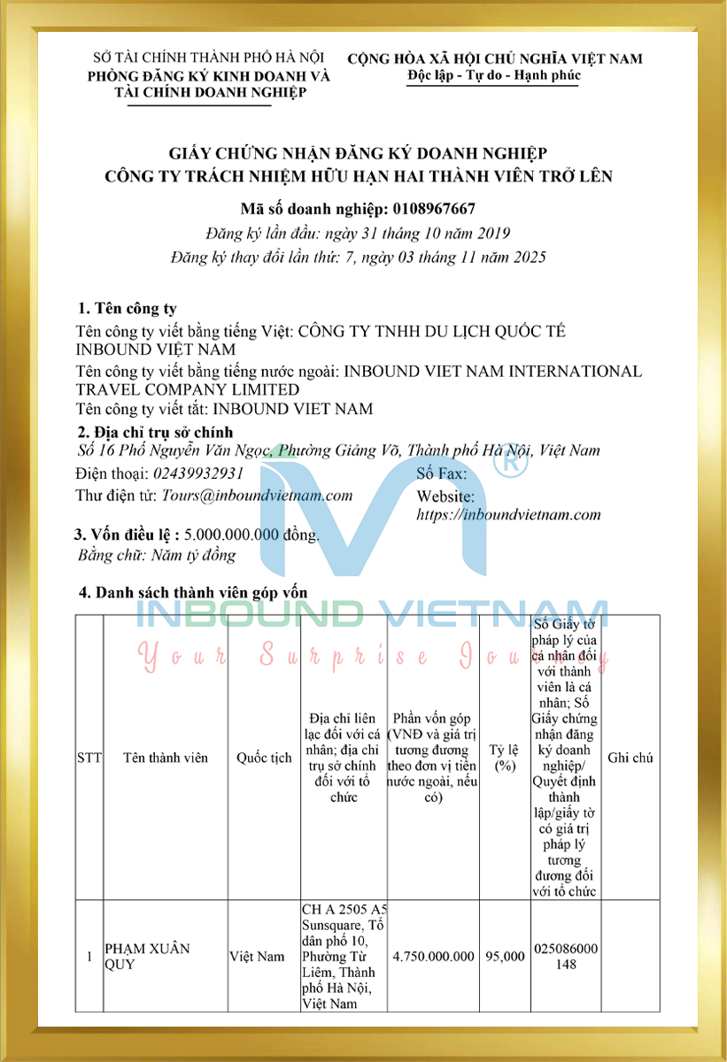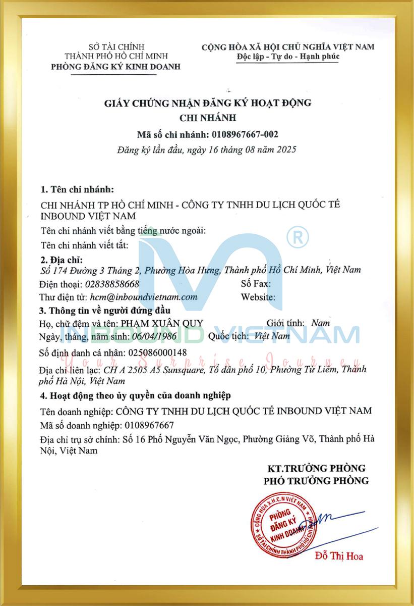 Inbound Vietnam International Travel Company Limited (website https://inboundvietnam.com/), Business code 0108967667, issued by Hanoi Department of Planning and Investment. International travel business license number: 01-1761/2023/TCDL-GP LHQT issued at Vietnam National Tourism Administration. Inbound Vietnam is a company that organizes and operates tours throughout Vietnam and other countries in the world. Inbound Vietnam provides airline ticket booking services for airlines, connecting domestic and international flights to create the most perfect and reasonable itinerary for each trip to meet the maximum needs of both domestic and international travelers. In addition, we also provide management consulting services, and temporary residence card services for foreigners in Vietnam, with fast, accurate processing times, helping customers save time and optimize costs. Most importantly, Inbound Vietnam has a dynamic, creative, and professional staff, stable financial resources, experience, and reputation in business sectors, along with a network of good service providers nationwide and internationally. We always strive to uphold all values to bring the best quality service products to our customers so that each trip is a pleasant surprise beyond expectations in terms of service quality, attentiveness, and stability in the true sense of "Your Surprise Journey"