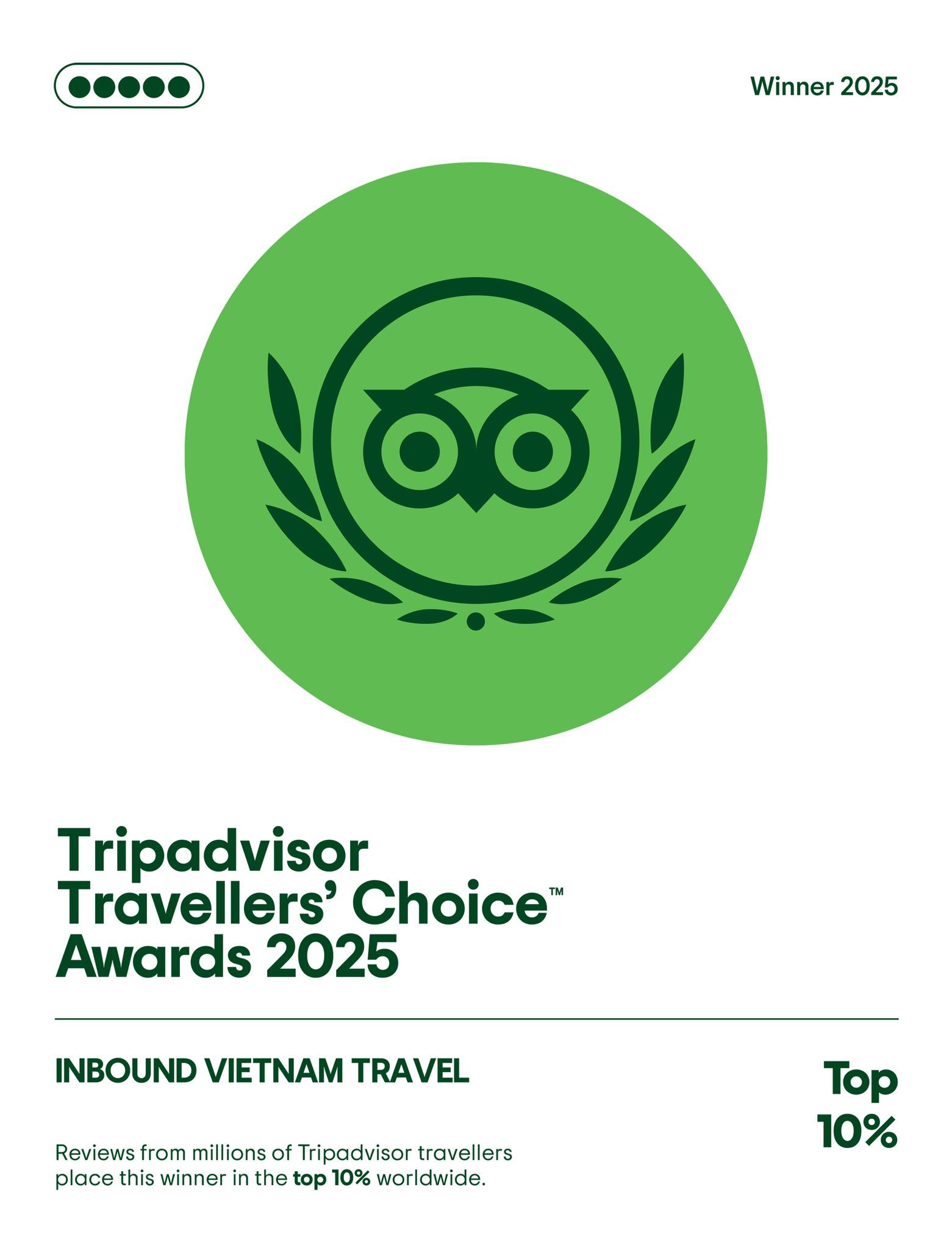 We are incredibly proud to have earned this esteemed recognition in 2024, and even more delighted to confirm that this July 2025, Inbound Vietnam Travel has once again been honored by TripAdvisor, continuing to rank among the top 10% of travel businesses worldwide. This highlights our unwavering commitment to maintaining and enhancing service quality, firmly establishing our position as a trusted partner for every exploration.