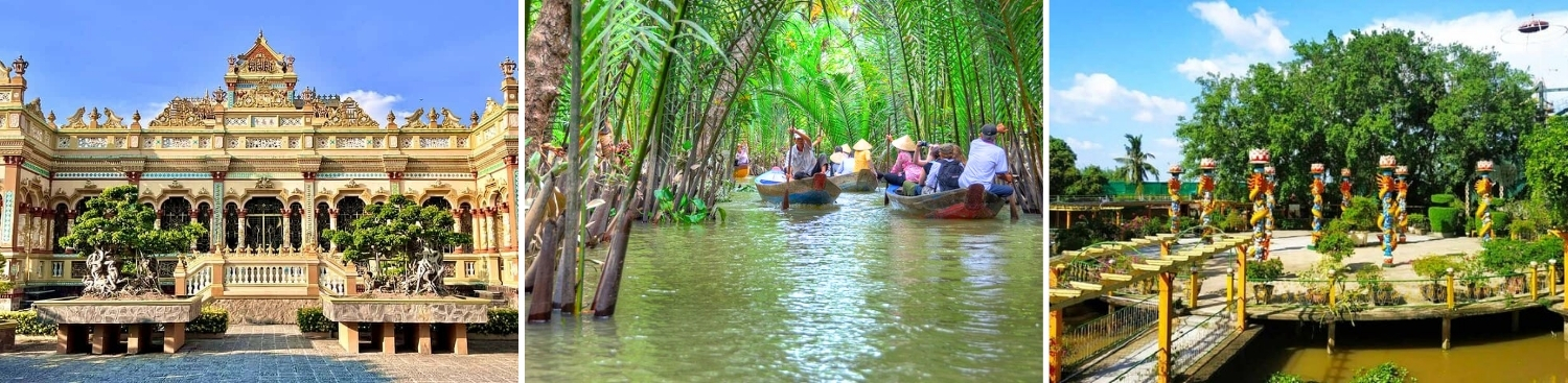 Leaving the hustle and bustle of Ho Chi Minh City and start your trip to depart for My Tho, the town lies on the left side of the Mekong River. Upon arrival, visit Vinh Trang pagoda which dated back to the late 19th century. Then boarding the sampan and cruising down the river around the four beautiful islands known as Dragon, Unicorn, Phoenix and Tortoise islands.Stop over at Unicorn Island, go walking around country lane and seeing orchards, enjoy tropical fruits, folk song music which performed by the local people. Visit the fruit plantation.