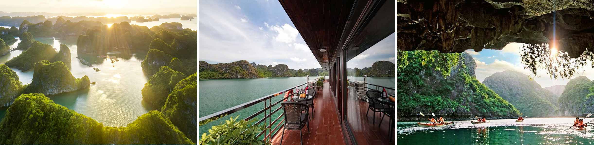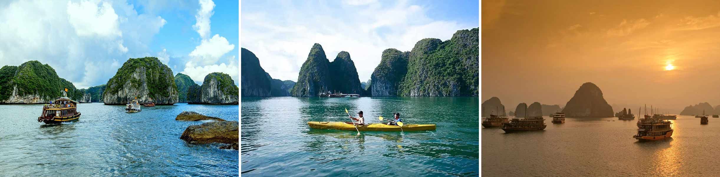 buffet lunch and enjoy the stunning views as the boat cruises towards the southeast of Halong Bay, passing the famous Fighting Roosters and Finger Islets. 14:30 - 16:00 Mingling yourself in the stunning views of the Bay and its dramatic limestone islets as we sail through the calm emerald waters heading to Luon Cave. Take your option either exploring the cave yourself on kayak or comfortably on bamboo boat rowed by the locals
